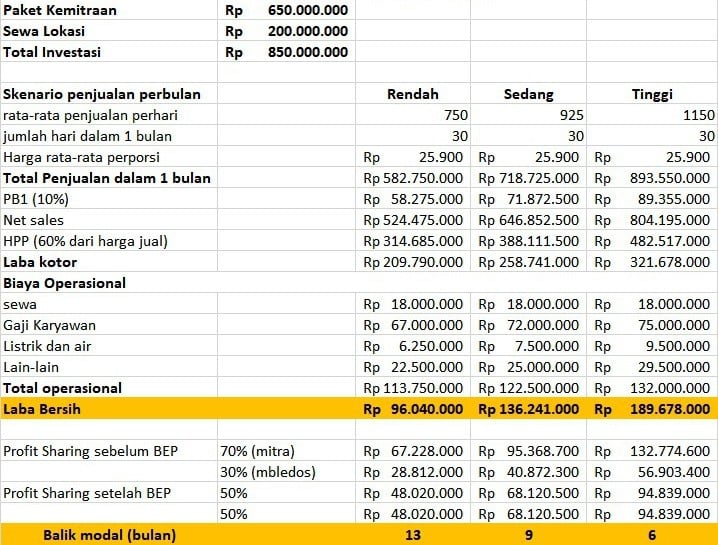 Perhitungan BEP sudah dilakukan secara cermat berdasarkan data historis penjualan rata-rata resto Dimsum Mbledos.
